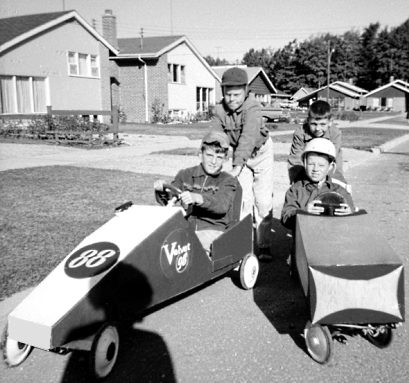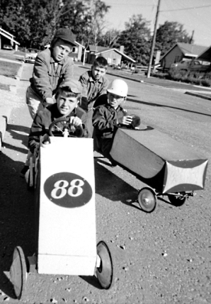 In 1960, nine year old David "helped" his dad build the (88) 'Soap Box Go-Kart' where he is pushing his younger brother Randy. Everything was recycled. The wood was second hand and the wheels were from an old wagon. The steering wheel was from a discarded baby buggy and the plastic numbers were donated by his dad's employer, BA Oil, from old gas pumps.